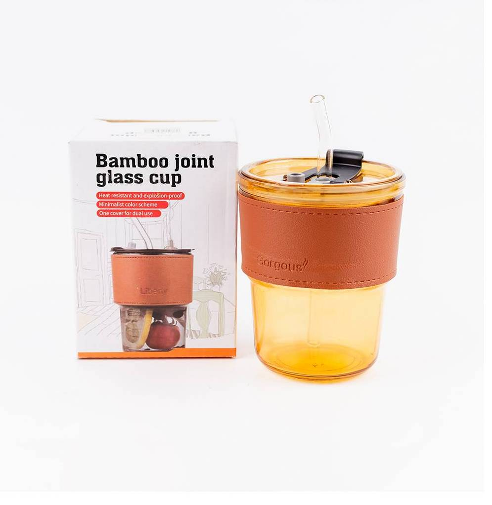 vaso de vidrio con gripp de cuerina bombilla y tapa