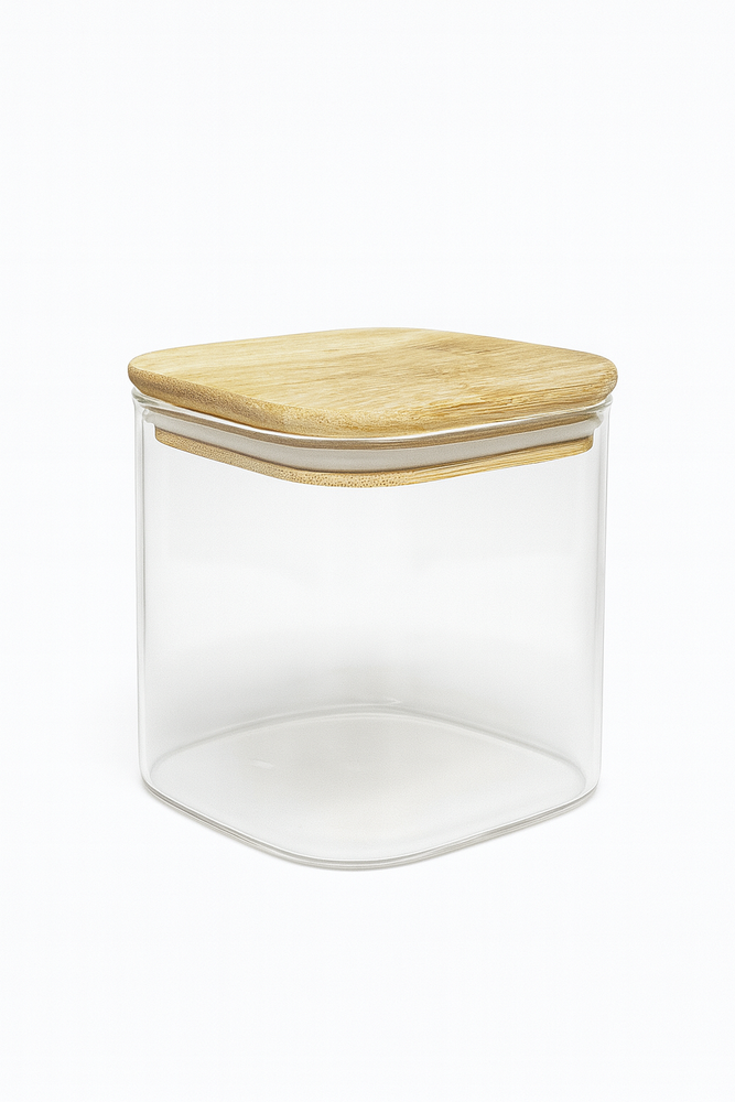 frasco de vidrio con tapa de bambu