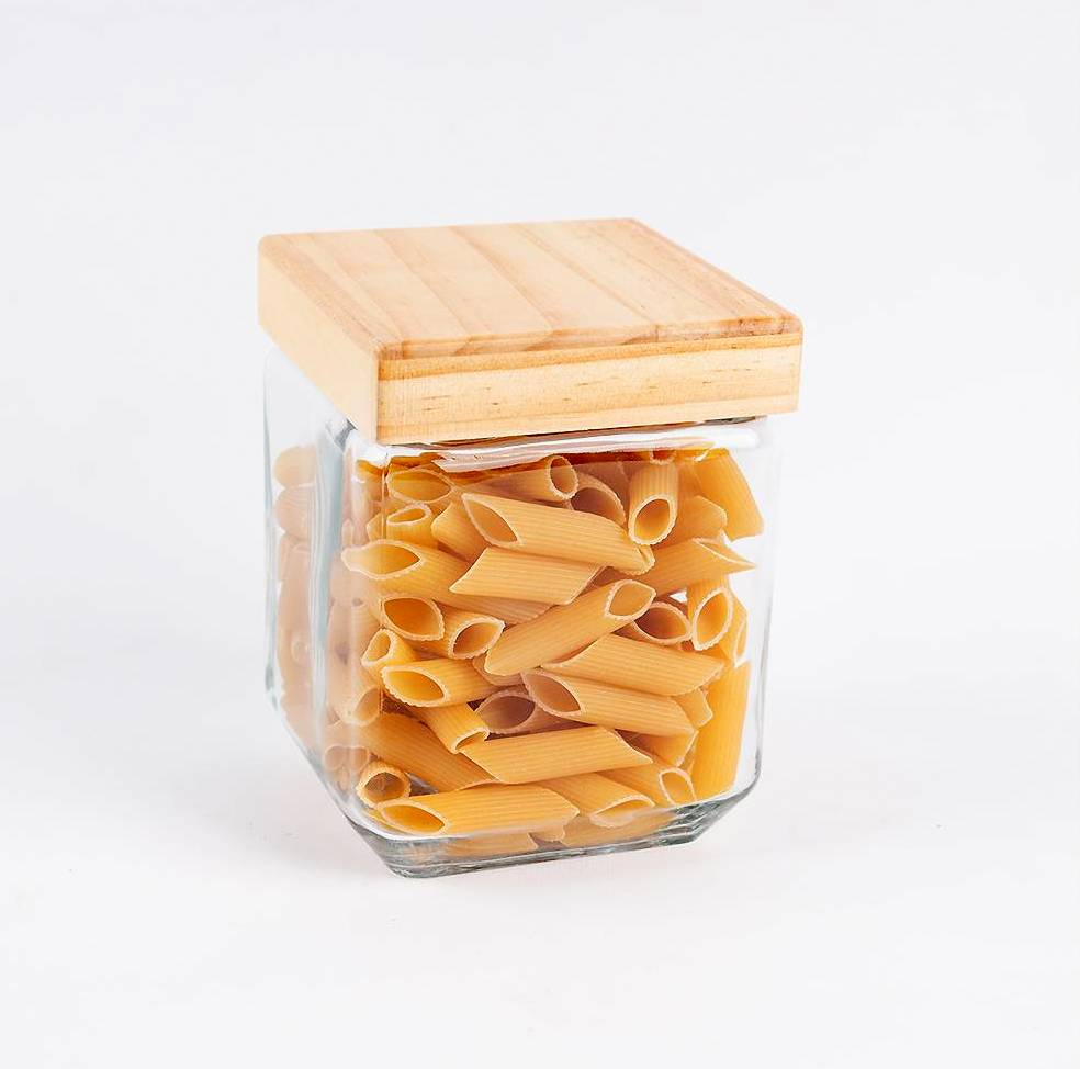 frasco de vidrio tapa madera base cuadrada