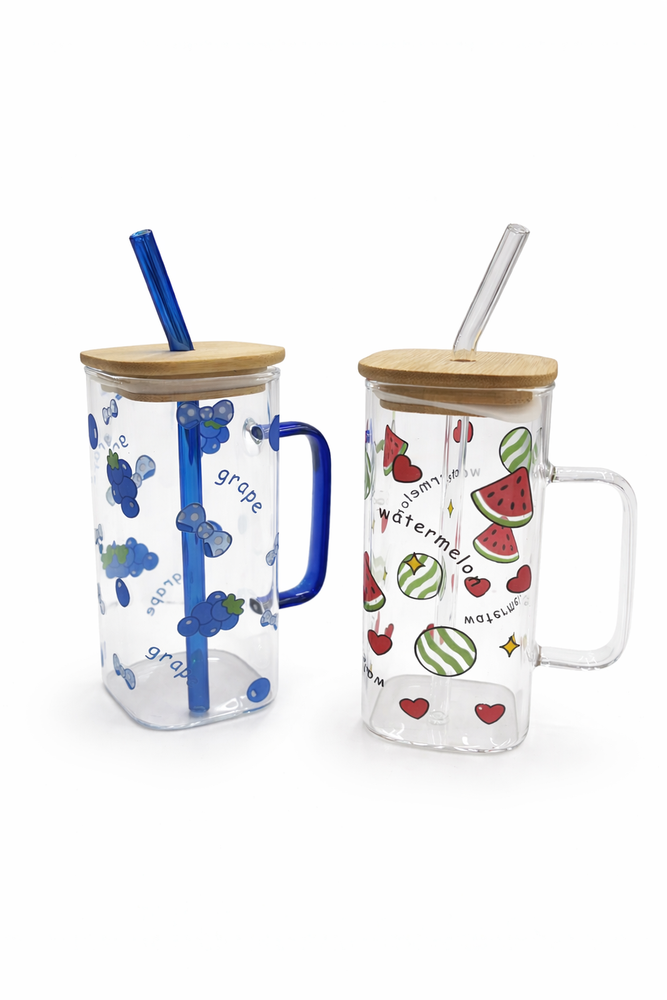 vaso de vidrio con tapa bambú y bombilla