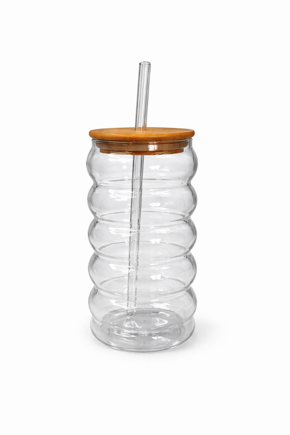 vaso de vidrio con tapa de bambú